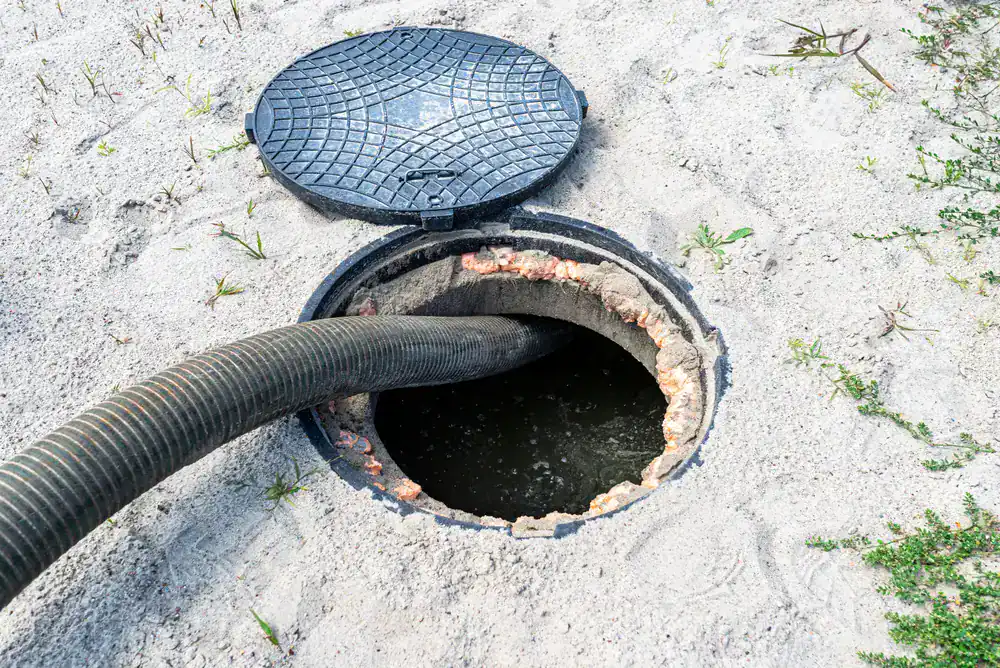 A large hose is inserted into an open septic tank in sandy soil, with the tank lid removed and resting nearby. Some grass and small plants surround the area.